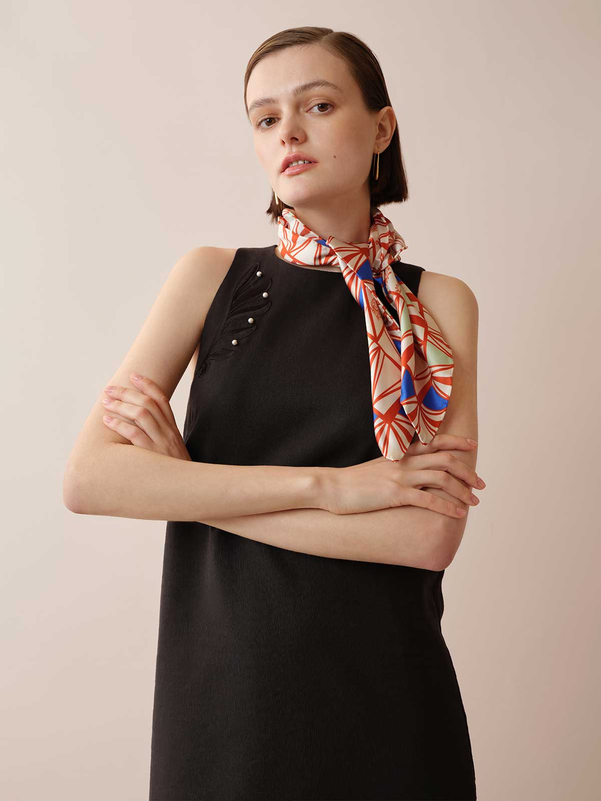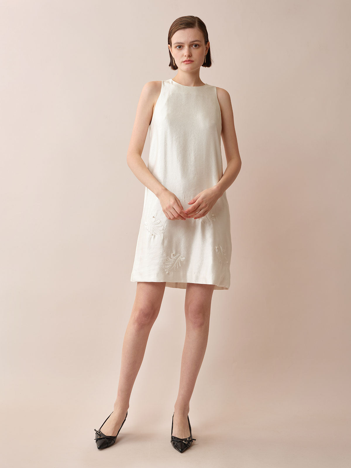The honeysuckle flower, embroidered subtly on this sleeveless dress, holds a deep spiritual significance in many cultures. They are seen as a symbol of love, beauty and devotion and are believed to have a powerful energy that promotes healing, often used in meditation. Crafted from an innovative blend of silk and linen hemp, this unique textile seamlessly combines the softness of silk with the breathability of hemp.
