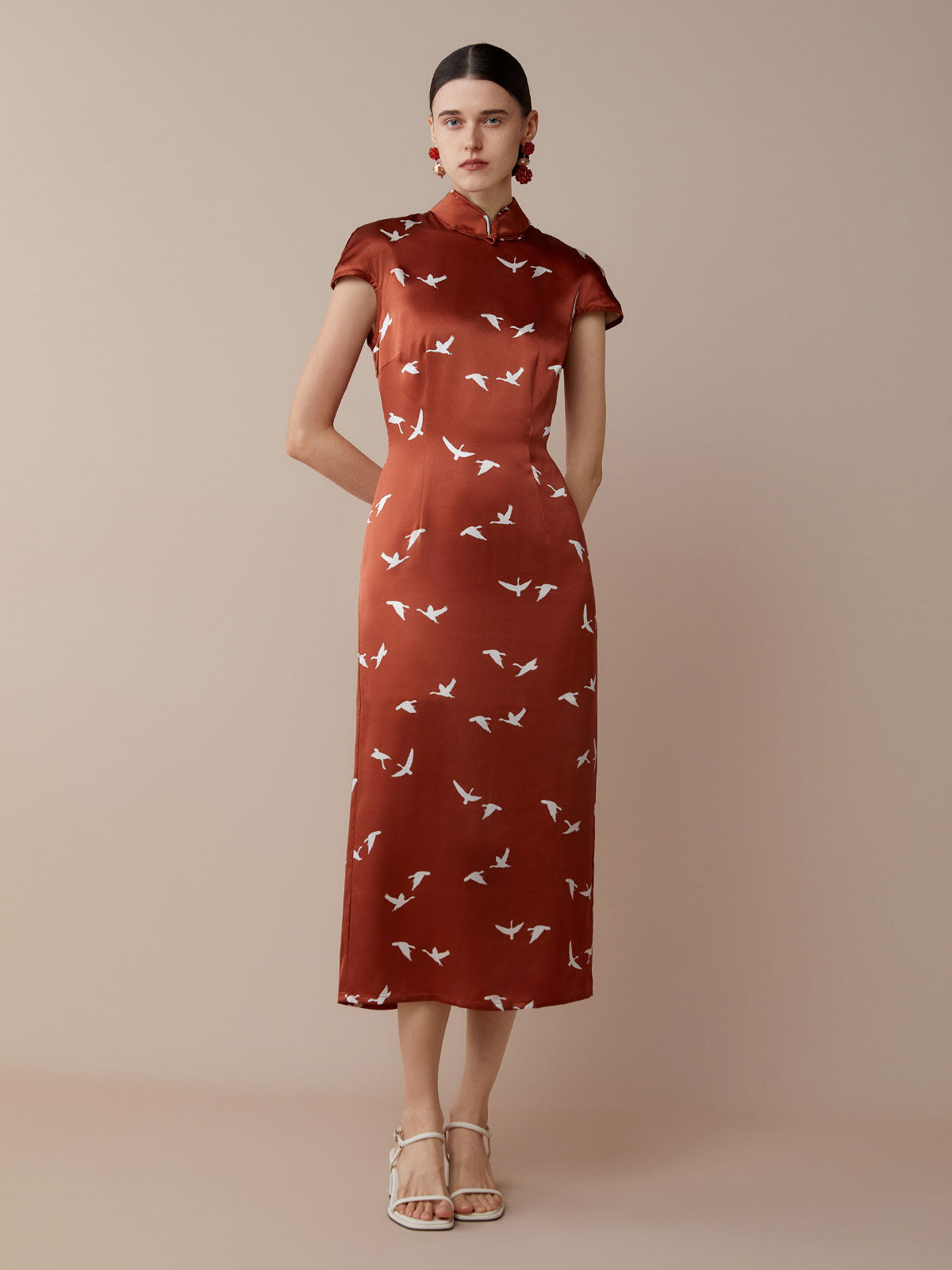 This long-sleeve dress from the Mountain and Sea Collection’s Xiaoman series (“Grain Buds” – one of China’s 24 seasonal markers) blends Eastern mystique with modern elegance. Crafted from stretch silk-blend fabric with a pearlescent finish, its flowing skirt and flared sleeves create poetic movement. The waist-defining silhouette and round neckline accentuate curves, while the mystical black-green palette and "butterfly-blossom" motif reflect Xiaoman’s celebration of nature’s quiet transformation. Lightweight yet structured, the dress transitions seamlessly from day to evening wear, embodying the "Silken Butterfly Whisper" theme – where resilience meets grace, and tradition merges with contemporary fluidity.