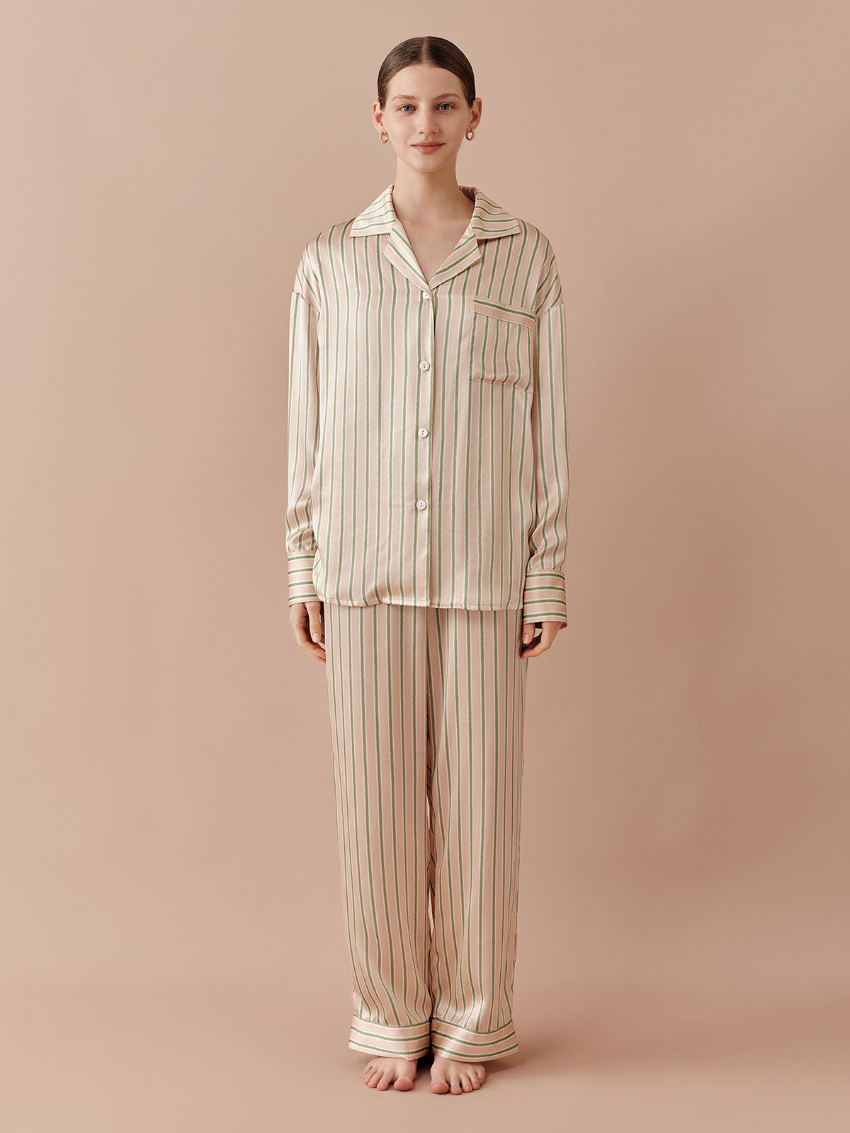 Inspired by the comfort and colors of menswear, this unisex short sleeved pajama set embraces striking stripes and practical design. Loose and comfortable and always including pockets. Crafted from sumptuous mulberry silk – these pajamas are breathable, machine washable and luxuriously soft.