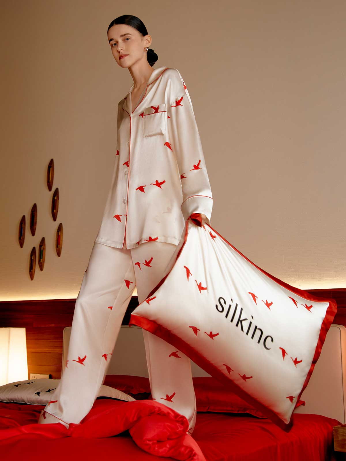 Red is believed to be the color of luck in China and is the predominant color to celebrate the Chinese New Year. A top and bottom pure mulberry silk set that can be worn as luxurious, soft pyjamas, loungewear or even separately. Our silk is 100% natural, light and soft on skin and has been designed to support your balance with the perfect sense of relaxation.
